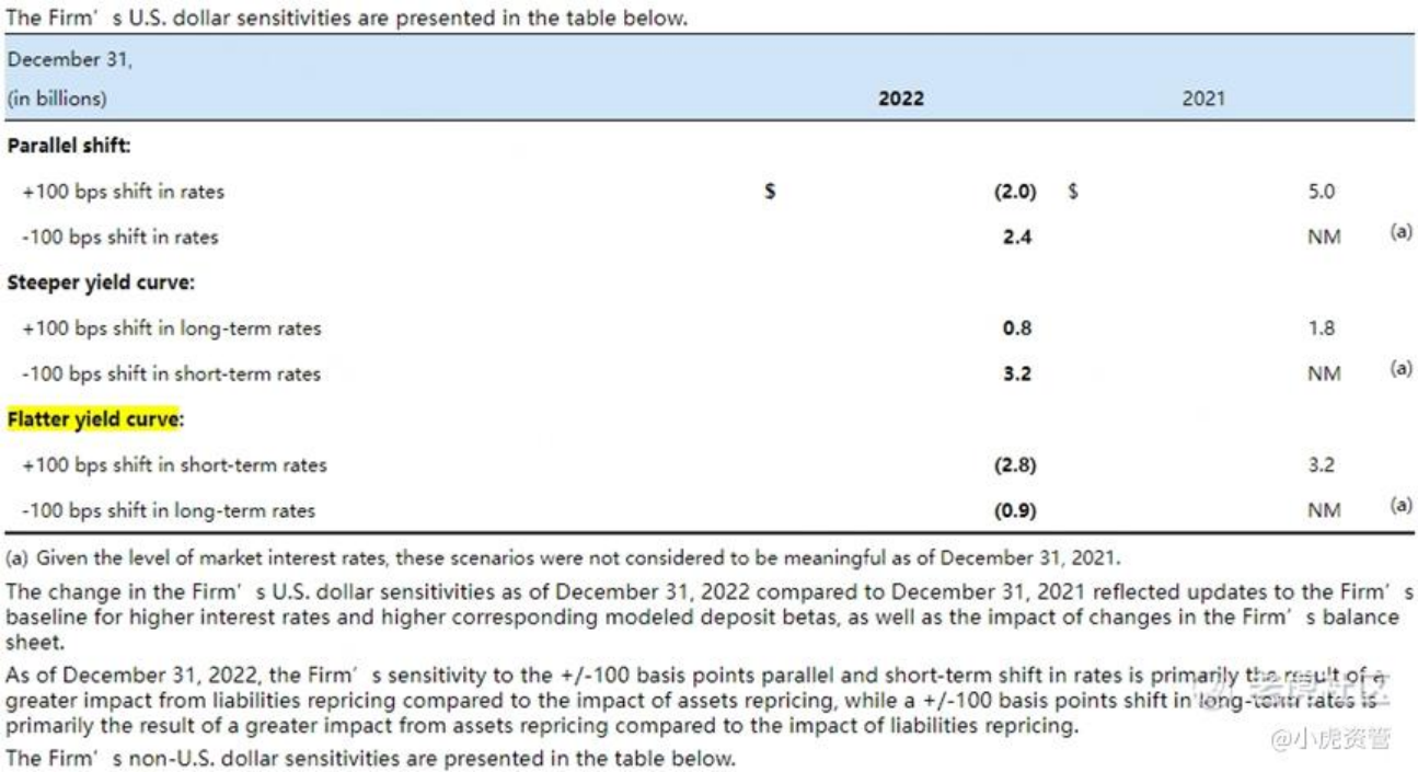 Therefore, the situation of banks' net interest margin narrowing may still be worsening. Once the May FOMC meeting adds another 25bps, the interest cost of banks' liability side may also increase by 25bps. Since the deposit interest rate on the liability side of banks is mostly short-term interest rates, while the credit interest rate on the asset side is mostly long-term fixed interest rates, according to JPMorgan's financial report, if both short-term and long-term interest rates rise by 100bps, the core net interest margin will lose $2 billion; if the short-term interest rate rises by 100 bps while the long-term interest rate remains unchanged, the net interest margin will lose $2.8 billion.