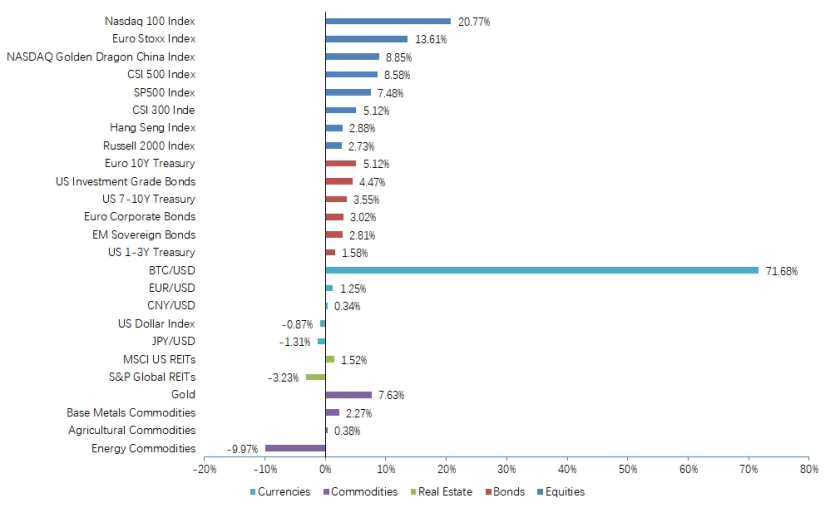 Looking back at Q1 2023, major global assets have performed well. Major stock indices have all posted positive returns, with the $NASDAQ(.IXIC)$ index up 20%, technically entering a bull market; bonds have also performed well, with US, European, and emerging market government bonds all performing well; Bitcoin has soared more than 70% in a single quarter. In addition, the weakness of the US dollar in Q4 continued, and the euro, yuan, and other currencies all had some gains. There was a significant differentiation in commodities, with $Gold - main 2306(GCmain)$ performing well and energy commodities dropping sharply.
