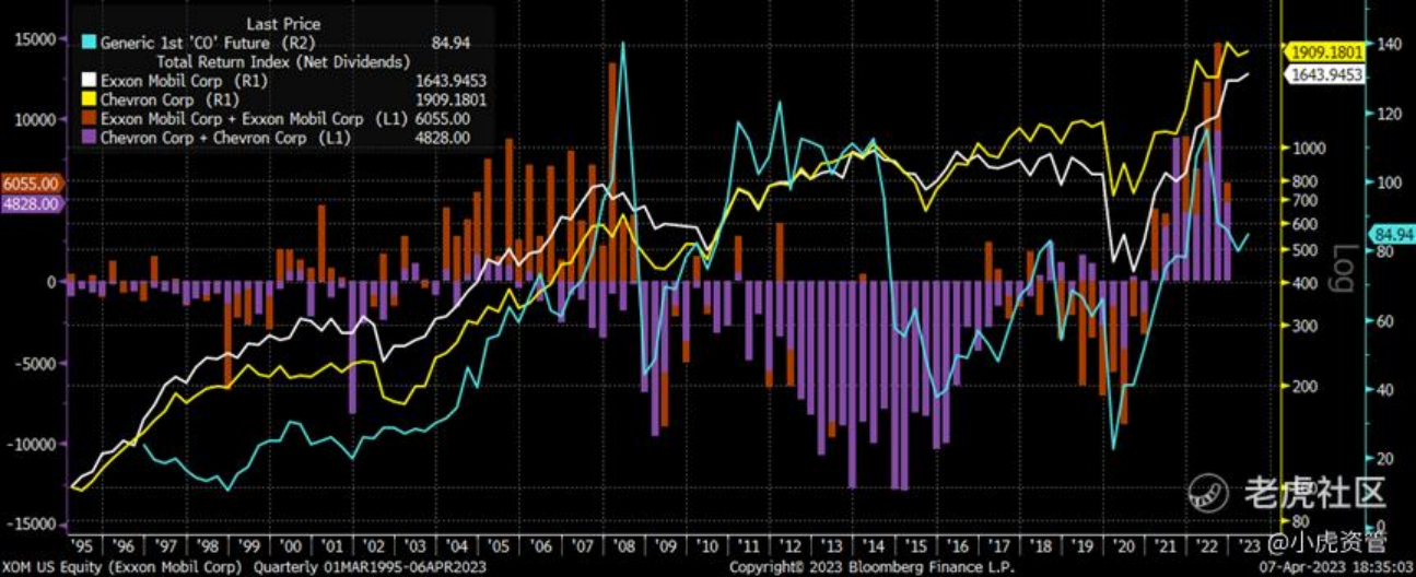 By subtracting the capital expenditures from the free cash flow for each quarter for both companies, we get the orange and purple bars in the graph below. It is clear from the graph that low capital expenditures and high cash flow periods often correspond to periods of rising total return indices that include dividends for both companies. At the same time, the rise of these two companies is not too affected by the fall in Brent crude oil prices $Brent Last Day Financial - main 2306(BZmain)$ (blue line), unless the oil price collapses, their stock prices will not see a significant retreat.