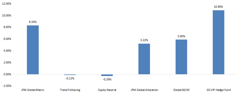 The specific indices are JPM Global Macro: Global Macro Opportunities Fund; Trend Following: Bloomberg GSAM Commodity Trend Index; Equity Neutral: HFRX Equity Hedged Strategy Index; JPM Global Allocation: JPMorgan Global Allocation Fund; Global 6040: Bloomberg Global 6040 Index; GS VIP Hedge Fund: Goldman Sachs Hedge Industry VIP ETF.