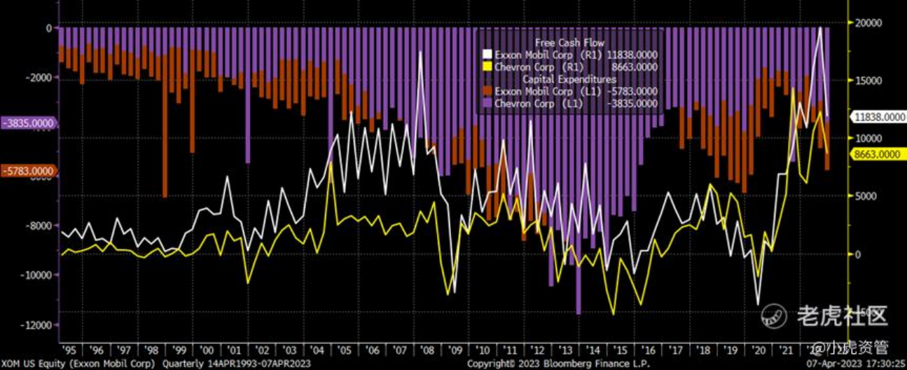 The white and yellow lines in the graph below represent the free cash flow of the two largest companies in the US energy sector, $Exxon Mobil(XOM)$ and $Chevron(CVX)$, respectively, with corresponding coordinates on the right axis. The orange and purple areas in the graph represent the capital expenditures (negative values) of these two global leaders, respectively, with corresponding coordinates on the left axis. It can be seen that the free cash flow of both companies is currently at its highest level in nearly 30 years, while their capital expenditures remain low.