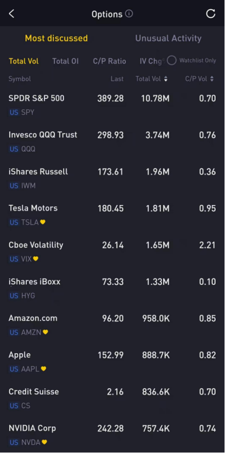 Top 10: SPY, QQQ, IWM, TSLA, VIX, HYG, AMZN, AAPL, CS, NVDA