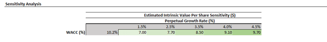 Paired with key valuation assumptions including a 10% WACC consistent with Palantir's cost structure and risk profile, as well as a 3.5% perpetual growth expectation (implied terminal value multiple of 9.7x) considering economic expansion in its core operating regions counting the U.S., Europe (primarily, the U.K.), and APAC (primarily, Japan and Korea), we remain hold-rated at an estimated base case intrinsic value in the $8 to $9 range. This is consistent with the stock's current levels, which trades more in line with the average among peers with a similar growth and profitability profile, and reflective of investors' lack of confidence in management's ambitious forward guidance.