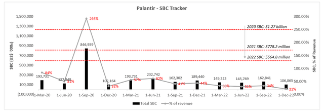 In the latest development, Palantir has guided commercial revenue contributions from its strategic investment contracts at $15 million to $17 million in the first quarter, down from $20 million in the fourth quarter and $39 million in 1Q22. The company has also written down $262 million in total remaining deal value attributable to the strategic investment program, which is consistent with growing signs of turmoil in pre-revenue and/or unprofitable start-ups due to deteriorating macroeconomic conditions - Fast Radius (FSRWQ), a SPAC that had entered into a6-year $45 million dealwith Palantir in May 2021 as part of the strategic investment program, filed forChapter 11 bankruptcyin November.