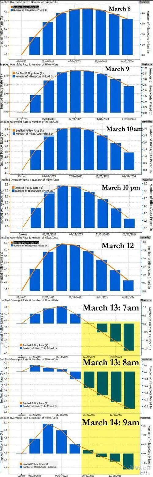 Just a week! Federal Reserve rate hike expects a "shocking reversal". The above pictures clearly show the expected changes in Fed rate hike before the thunder on March 8, the thunder of Silicon Valley banks on March 9, the bankruptcy and takeover on March 10, the emergency meeting on March 11, the joint statement of the Big Three and the launch of BTFP new tools on March 12, and the reopening of global financial markets on March 13.