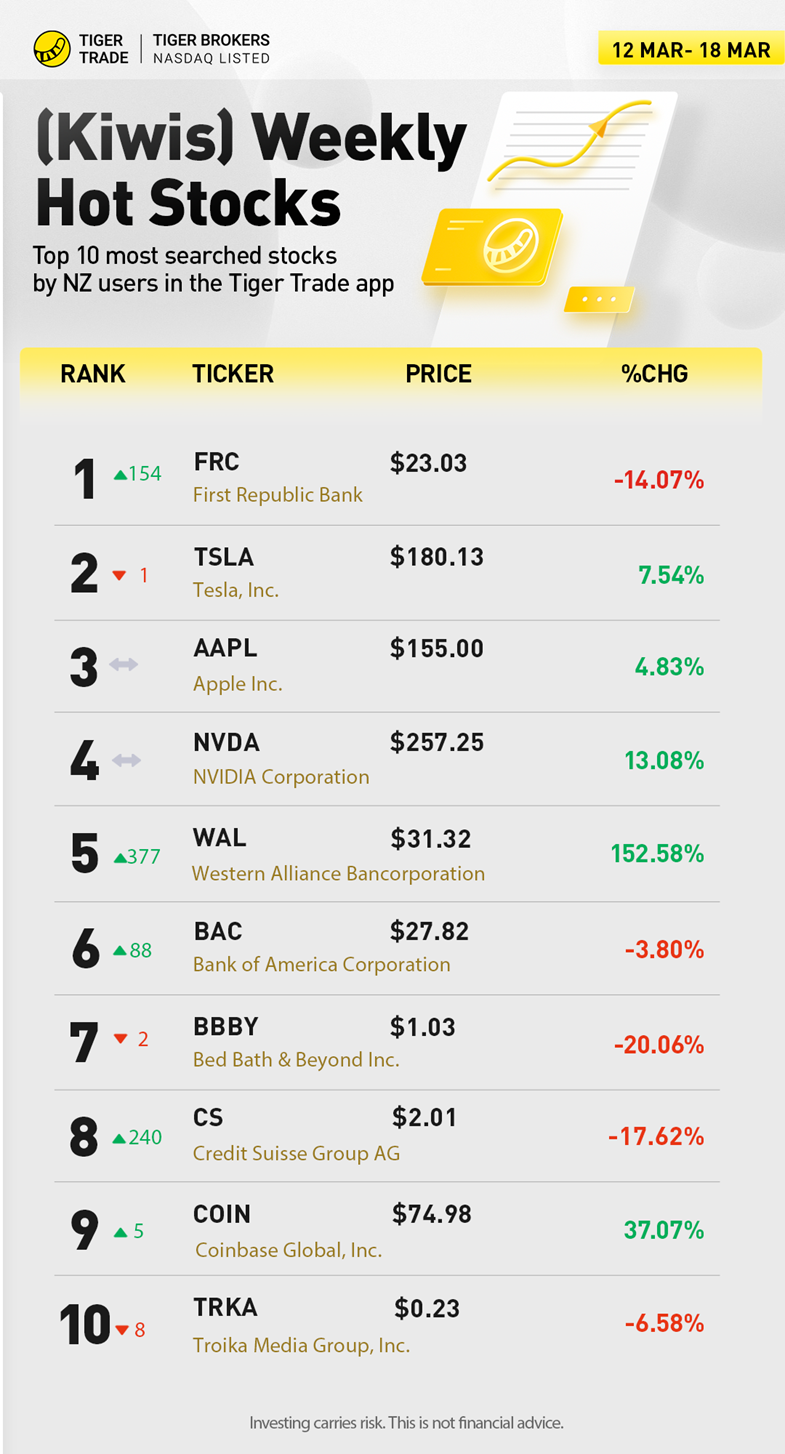 $Tesla Motors(TSLA)$ $First Republic Bank(FRC)$ $Apple(AAPL)$ $NVIDIA Corp(NVDA)$ $Western Alliance(WAL)$ $Bed Bath & Beyond(BBBY)$ $Credit Suisse Group AG(CS)$ $Coinbase Global, Inc.(COIN)$ $Troika Media Group Inc.(TRKA)$ (NIO)$
