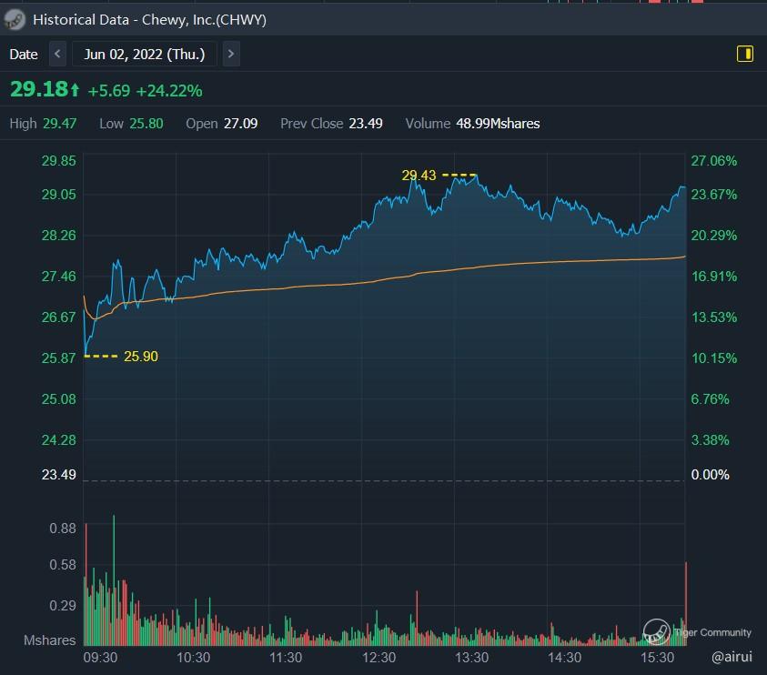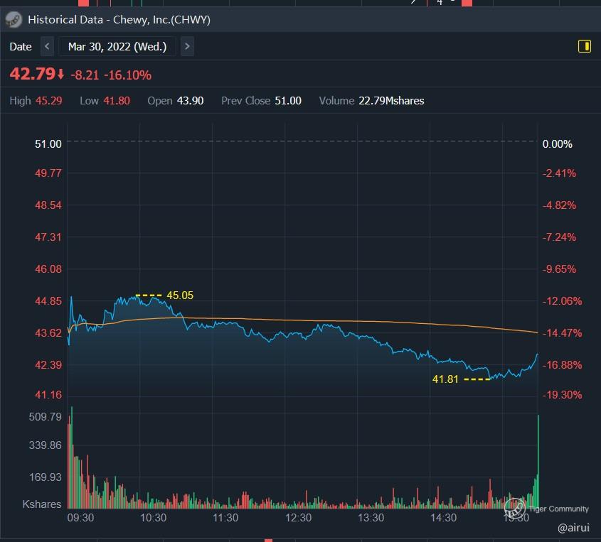 $Chewy, Inc.(CHWY)$ Chewy Inc. is an online retailer of pet products that has consistently beat analysts' expectations for net sales and has seen a growing active customer base. However, the stock can be very volatile following its earnings report, making it difficult to predict how the share price will react. As a result, selling options may be a profitable strategy to take advantage of the volatility of the stock.