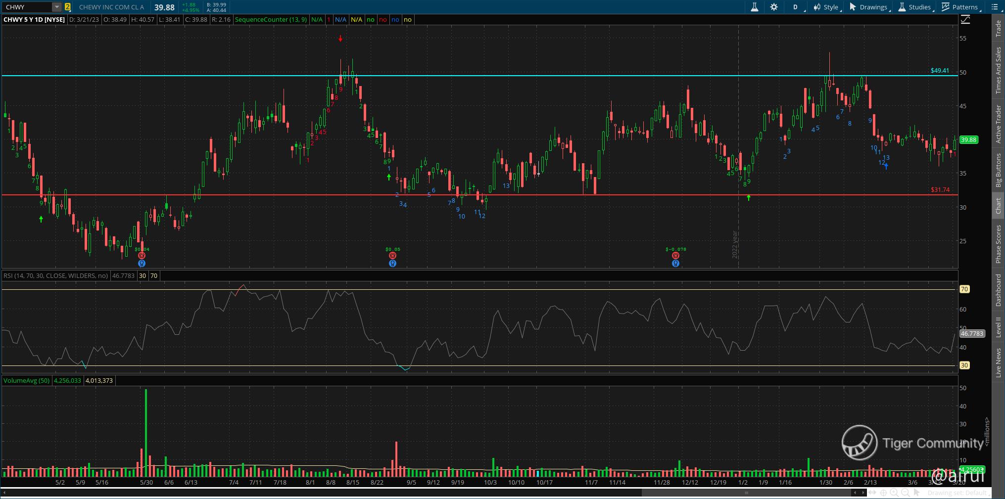 Based on the day chart below, the resistance level for Chewy shares is around 49, while the support level is around 31. With the stock closing yesterday at 39.88, this means the resistance and support levels are around 20% from the current trading price.