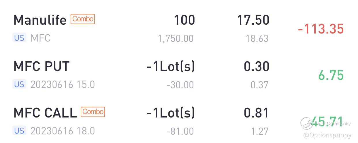 In the case of Manulife stock, assuming the stock is trading within a range of $17 to $19, an investor can sell a call option with a strike price of $18 and a put option with a strike price of $15 for around 4 months . By doing this, they will receive a premium for both options and be able to profit if the stock remains within the given range. The sell call I got 1.30 and the sell put I got 0.40