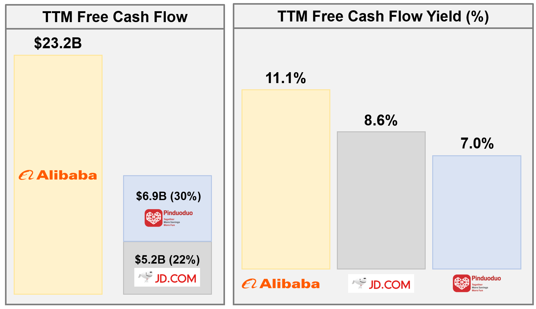 $Alibaba(BABA)$'s Free Cash Flow (FCF) in the trailing twelve months (TTM) was US$23.2B. By comparison, $Pinduoduo Inc.(PDD)$'s & $JD.com(JD)$'s combined FCFs were $12.2B or 52% of $Alibaba(BABA)$'s. $Alibaba(BABA)$ is trading at 11.1 TTM FCF yield vs. 8.6 & 7.0 for $JD.com(JD)$ and $Pinduoduo Inc.(PDD)$ respectively.