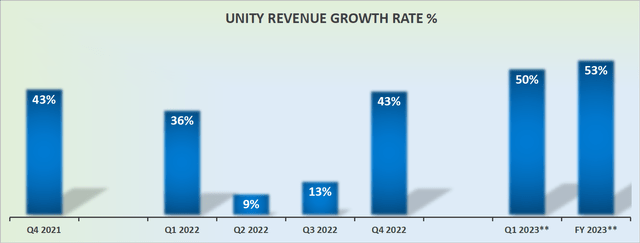 On the surface, we see that Unity's revenue growth rates areaccelerating significantly. Case in point, Q1 2023 is guided to grow by 50% y/y compared with Q4 2022 which reported 43% y/y growth rates. That's a massive amount of acceleration.