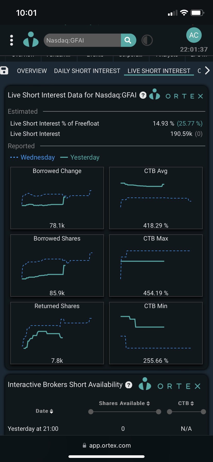 $GUARDFORCE AI CO., LIMITED(GFAI)$ strong candidate for short squeeze next week. Live short interest increased 26% TODAY. Cost to borrow min 256%. Historically squeezed to $30s and higher from $8-$12 range. 98.6% utilization. They released some pressure earlier in week but longs have held on into close today. SQUEEZE IMMIMENT! microfloat like $BigBear.ai Holdings(BBAI)$ $Shiftpixy Inc.(PIXY)$, it is interesting