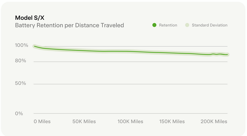 Real talk — We don’t really get this question. What we get asked is what is the range you get on your used Tesla. We also get questions about how to predict battery failure but that is unlikley and rare for a Tesla battery to fail. Tesla has a generous warranty for battery and customers have had their battery replaced under warranty from Tesla