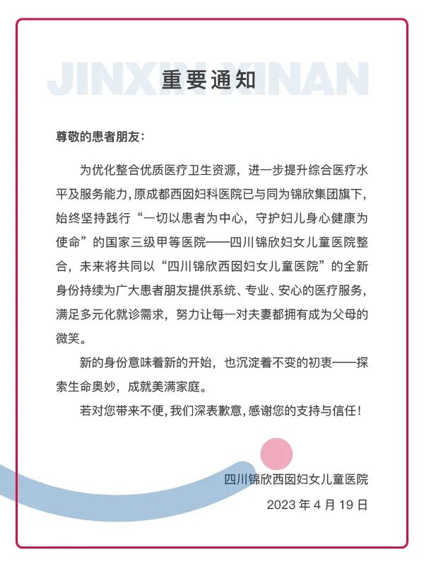 4月18日,爲實現IVF孕產一體化,原成都西囡婦科醫院正式升級爲四川錦欣西囡婦女兒童醫院。新的名字,意味着新的開始。更名後,成都西囡婦科醫院將聯合國家三級甲等四川錦欣婦女兒童醫院,共同以“四川錦欣西囡婦女兒童醫院”不同院區的身份,合力爲婦女、兒童身心健康提供更加完善的臨牀醫療、計劃生育、健康保障等服務。