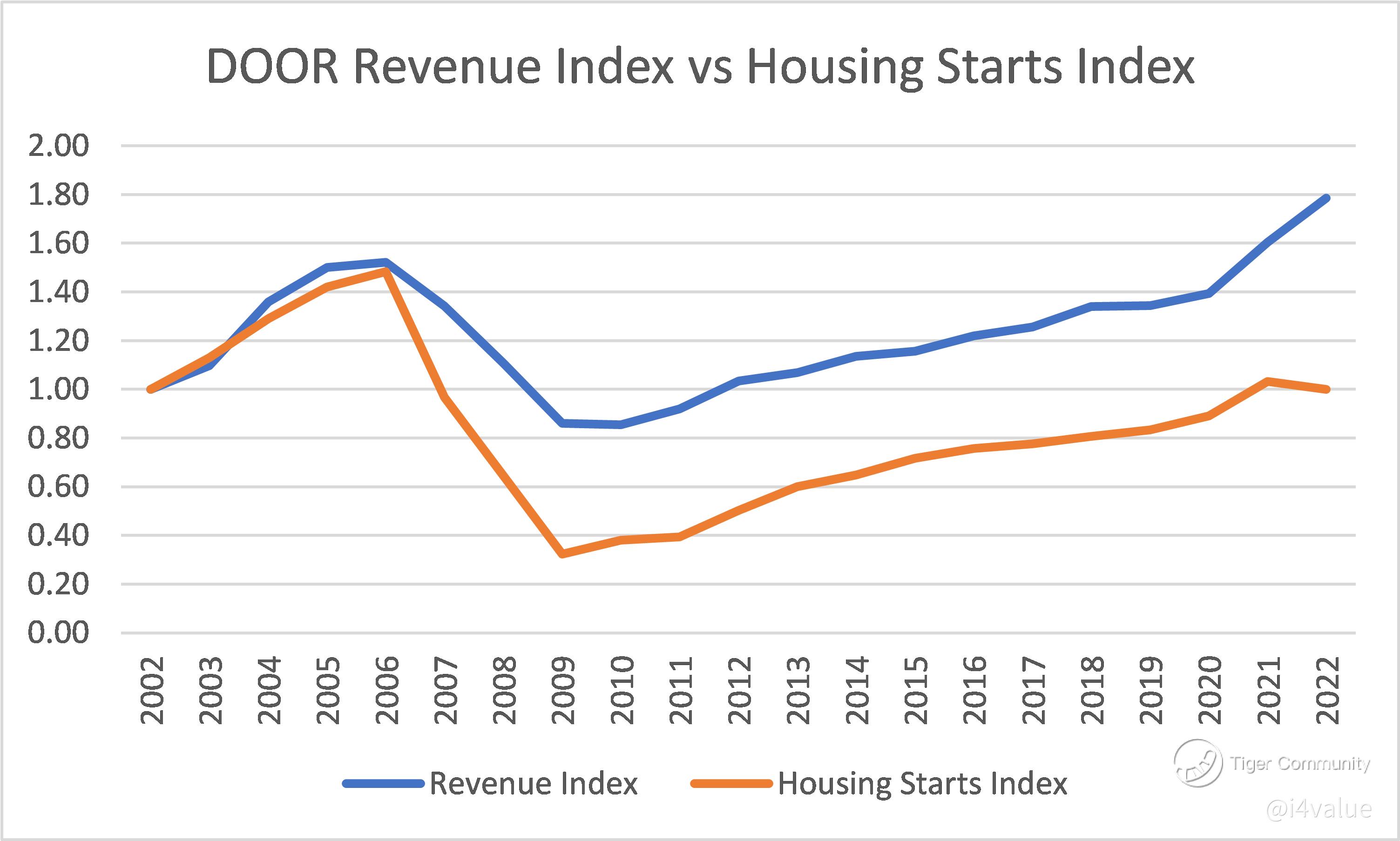 DOOR benefited from being in the uptrend leg of the Housing Starts cycle. When the Housing Starts enters the downtrend leg of its cycle, DOOR revenue will follow the decline.