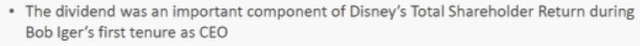 As a final point on the dividend restoration topic, I found the references on slide 11 of the presentation directly linking Bob Iger to dividend payments rather bizarre. I can’t recall ever seeing a company presentation pump up the influence of a CEO on dividend payments in this manner and it seems odd that the Board would allow such wording. I’m left with the uncomfortable feeling that the Board has been captured by ‘Cult of Iger’ thinking. The message to investors appears to be - ‘don’t worry, Bob Iger is back, dividends are coming’. I’d counter that message with – ‘but he’s only here for two years!’.