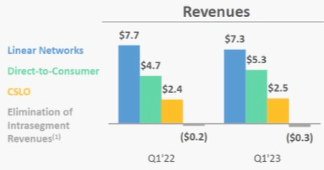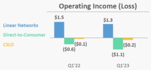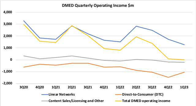 The1Q23 presentationincludes a chart (Exhibit 1) which, if looked at in isolation, can be interpreted to tell a comforting story: DIS, ever looking to the future, predicted the decline of Linear Networks (traditional content distribution) and pushed forward with the Direct-to-Consumer strategy (a streaming model) to protect and grow the DMED business. Exhibit 1 shows quarterly Linear Networks revenue declining from the previous comparable period, but with the loss of revenue being more than offset by revenue growth in DTC. The plan is working! Except it isn’t.