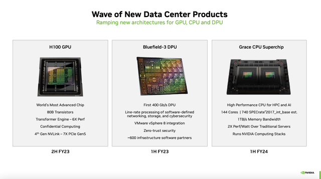 The company's latest flagship product, Hopper (H100)GPU, offers significant acceleration in computing power, which is essential when demand for such technology is increasing, mainly due to the popularity of generative AI tools like OpenAI's ChatGPT. More specifically, the H100 is up to 30 times faster at AI inferencing for transformer-based large language models like Open AI's ChatGPT than its predecessor. As a result, the AI Wars and intense competition between Microsoft Corporation (MSFT) and Alphabet Inc. (GOOGL) should support Nvidia's growth for the foreseeable future.