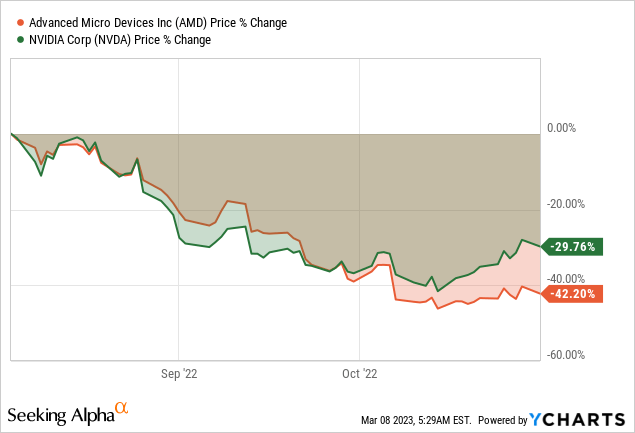 Shortly before the announcement in October, all semiconductor stocks were declining, but NVDA has suffered the most with around a 40% plunge. On the contrary, Advanced Micro Devices, Inc. (NASDAQ:AMD) stock was more resilient to these forces, but the overall negative sentiment on the sector has suppressed AMD's valuations to lower levels, creating a very attractive entry point.