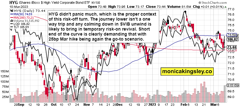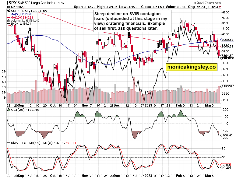 S&P 500 gave up the two opening rebounds as the SVIB meeting FDIC – and the contagion fears – hit, forcing a very sharp reversal in short-term yields, with 25bp Mar rate hike now being the base scenario. The bank run fears are overdone (unfounded) and should result in dialing back the hammering in my view, with the real problem being old fashioned deposit outflows as risk-free rate of return (in CDs, T-Bills and money market funds that ultimately park reserves at the Fed whenever short-dated Treasuries are in short supply), and no other problems are immediately palpable as the zombification and crowding out of productive investments by rates too low for too long, would be only painfully and slowly unwound.
