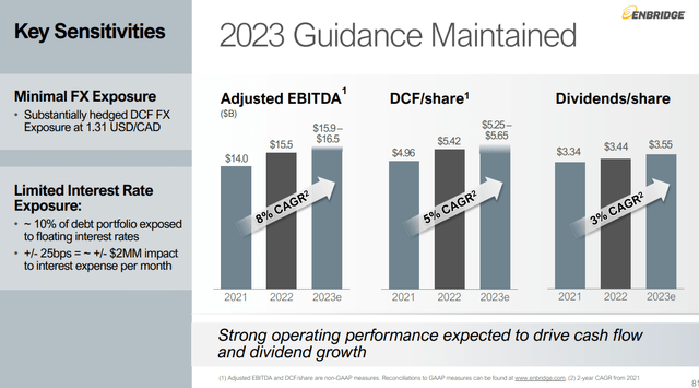 Three other things keep the stock price from ever reaching escape velocity. The first is debt. They are in a capex-intensive business and carry an inordinate amount of it - currently some $53 bn USD, a figure at which they've been chipping away recently as interest rates have risen. It was $56 bn a year ago, so that's $3 bn to the good. You might explain away carrying this amount of debt in the interest rate era that wound up in late 2021. It's already starting to show up on the balance sheet as ENB paid about $250 mm more interest YoY from 2021-2022.It should be noted, as they do in the slide below that ENB doesn't consider this debt excessive, and it is well managed with cash flow on their balance sheet....so far. The debt here is worrisome in a rising interest rate environment... to me, anyway.