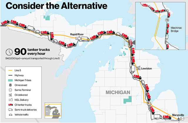 It's a fight made even more absurd by the fact Line-5 is the primary source of supply for about half a million BOPD of propane and NGLs - 65% and 55%, respectively - upon which thousands of Michiganders rely for winter heating. Enbridge estimates that2,100 tanker trucks dailywould be needed to replace it.