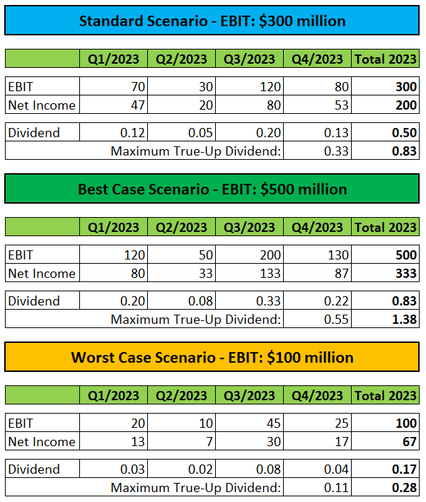 Anyway, assuming approximately two thirds of ZIM's earnings to be generated in the second half of the year would result in the following scenarios for net income and quarterly dividend payments: