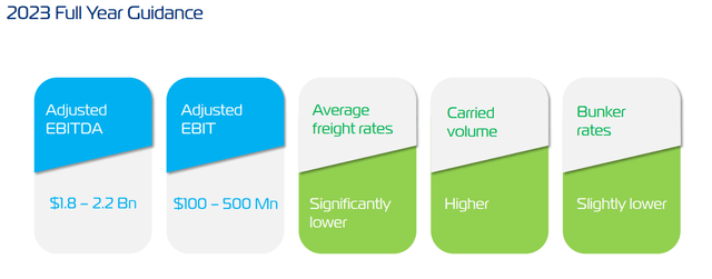 While the upcoming dividend payment and above-discussed capex commitments will reduce cash on hand to approximately $3.7 billion, the company's 2023 guidance doesn't point to ZIM burning cash from operations this year which would be quite an achievement in the current market environment.