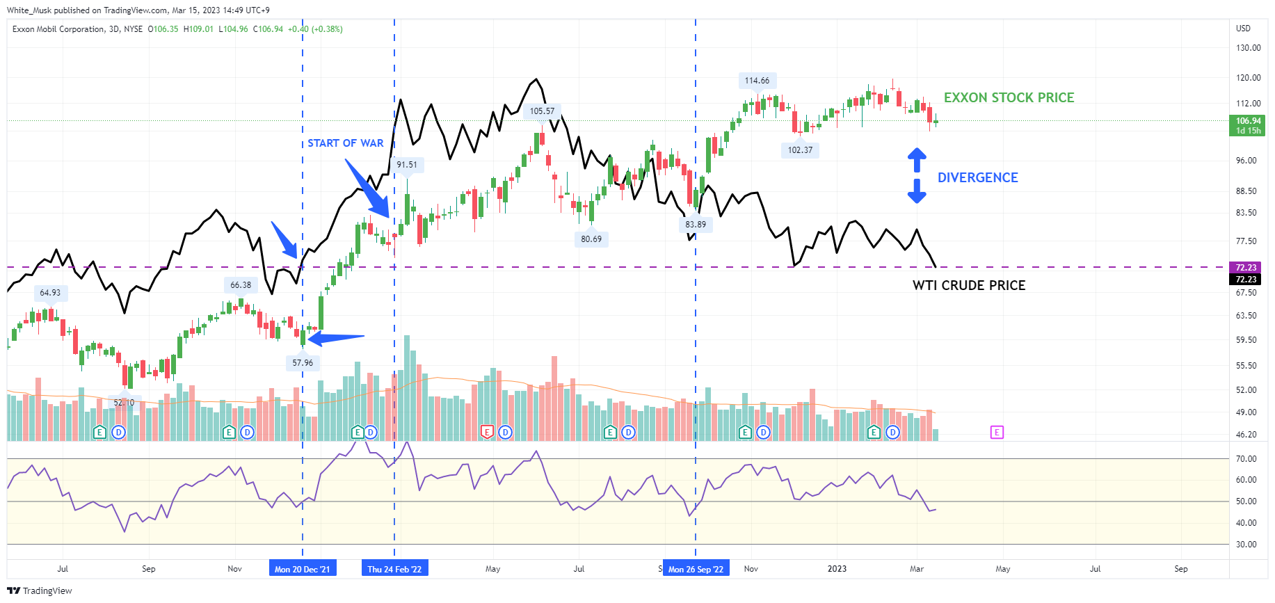 However Winter is over and oil price has been as depressed as ever. The last time when WTI was trading at $77.23 was on 20/Dec/2021, and Exxon was only trading at $57.96. But today it is trading at $106.94.