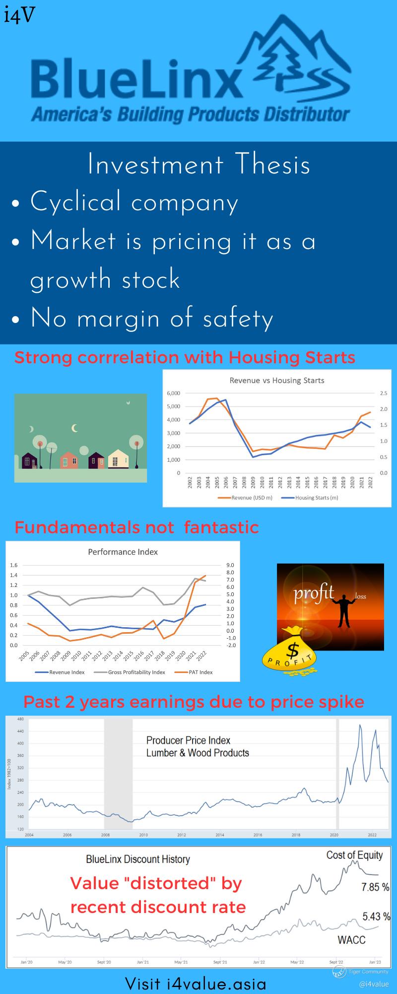 There is a strong correlation between $BlueLinx(BXC)$ revenue and US Housing Starts. Housing Starts is cyclical and BXC should be analyzed and valued as a cyclical company.