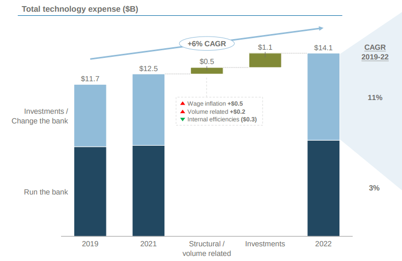 JPMorgan invests heavily in digital transformation to enhance customer experiences and drive growth. As a result, the bank is keeping its expenses flat while doubling its volumes, with total technology expenses expanding to$14.1billion in 2022 at a CAGR of 6% from 2019 to 2022. In addition, across its business segments, JPMorgan is investing $4.1 billion in developing its products, platforms, and infrastructure.