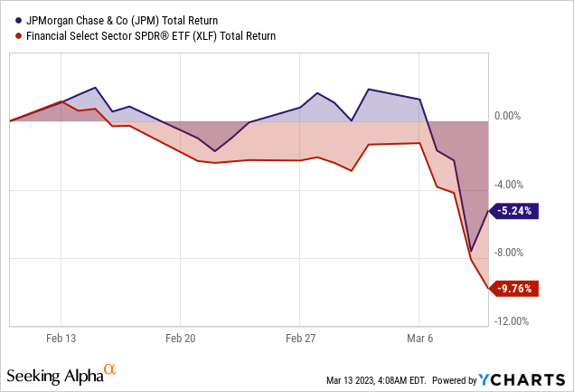 Thus, large banks such as JPMorgan Chase & Co. (NYSE:JPM) are generally far more liquid than smaller ones, have much more capital, are likely much better at managing risk, and are subject to regulatory monitoring. As a result, following the sell-off, investors get a better entry point at JPM, a reputable bank that is well-capitalized to weather the storm.
