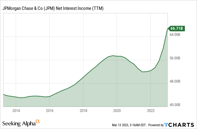 JPMorgan's profits have been driven by higher interest rates, with net interest income up 28% in 2022. In addition, the Federal Reserve's aggressive rate hikes to control inflation have allowed banks to charge more for loans, indicating a favorable outlook for JPM which continues expanding its profitability while offsetting the increasing operating cost pressures (i.e., higher labor costs).