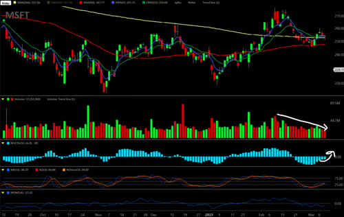Sell vol decreasing and VIX is falling. Not sure what you need more ... reversal in progress with MACD flipping over soon. Tomorrow we should see 5 day EMA cross over 13 day triggering a buy signal. Avoiding the noise. Looking at the better side as more companies adopt ChatGPT, msft is gonna get profit share from OpenAI 49% stake. March 17th is the MSFT event.