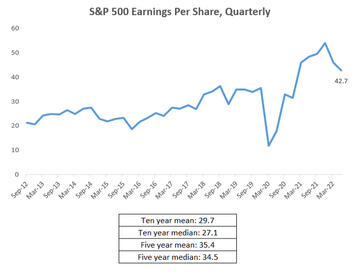 For Q2 2022, the EPS of the S&P 500 was 42.7, which was still above the ten-year or five-year average. If we assume it will revert to the average, or at least move closer to it, we can expect earnings to fall.