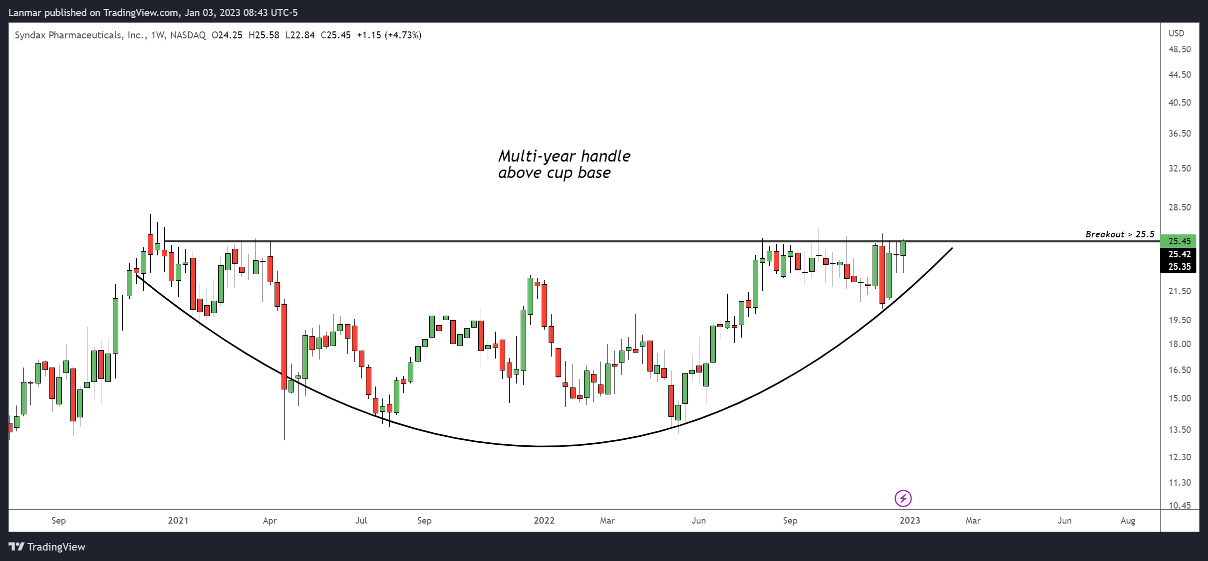 SNDX$Syndax Pharmaceuticals(SNDX)$ is probably my favorite set-up going into 2023. Bigger picture want to see that 50 day MA hold. Looks like it could be ready to start the year strong.SNDX shows signs of strong accumulation longer term. Overall really strong base on base action and getting close to a potential breakout.