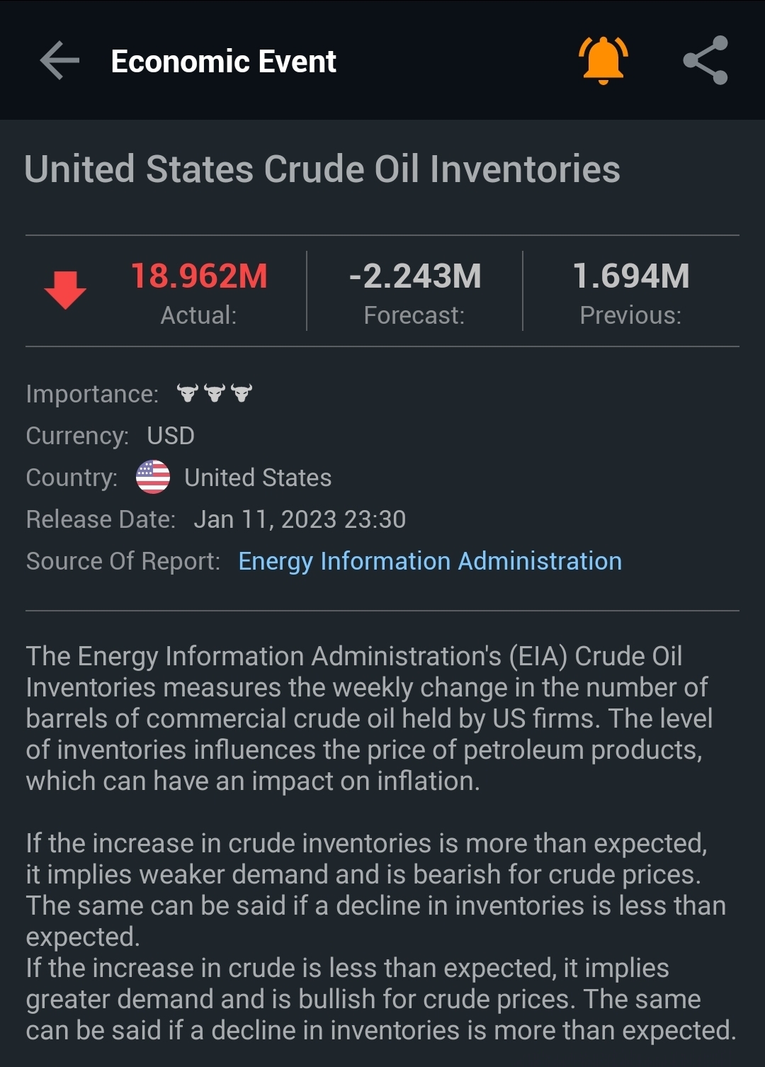 The US crude oil inventory was expecting a -2.243 million (drop) in inventory but instead saw an increase of 18.962 million.