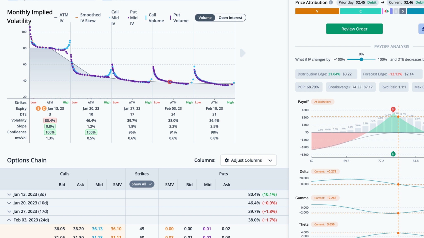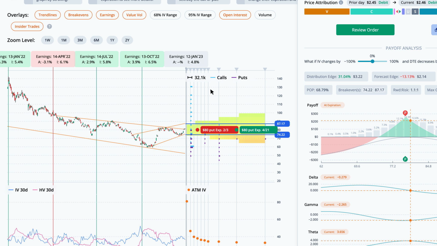 This helps narrow the results to trades that are fairly priced. The highest ranked trade is a LongPutCalendar with strikes at 80, expiring on Friday, Febuary 3rd and Friday, April 21st, for a debit of $2.46.