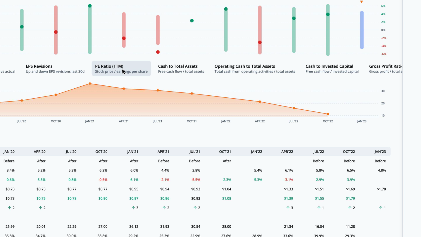 During that time, the post-earnings move was outside of the implied range 3 times. In those cases, long straddles were profitable. The rest of the earnings moves likely yielded profitable short straddles. We can overlay quarterly financial data by clicking on the ratios below the earn move graph. Let’s look at the PE ratio, which is the stock price divided by the trailing twelve months earnings per share.