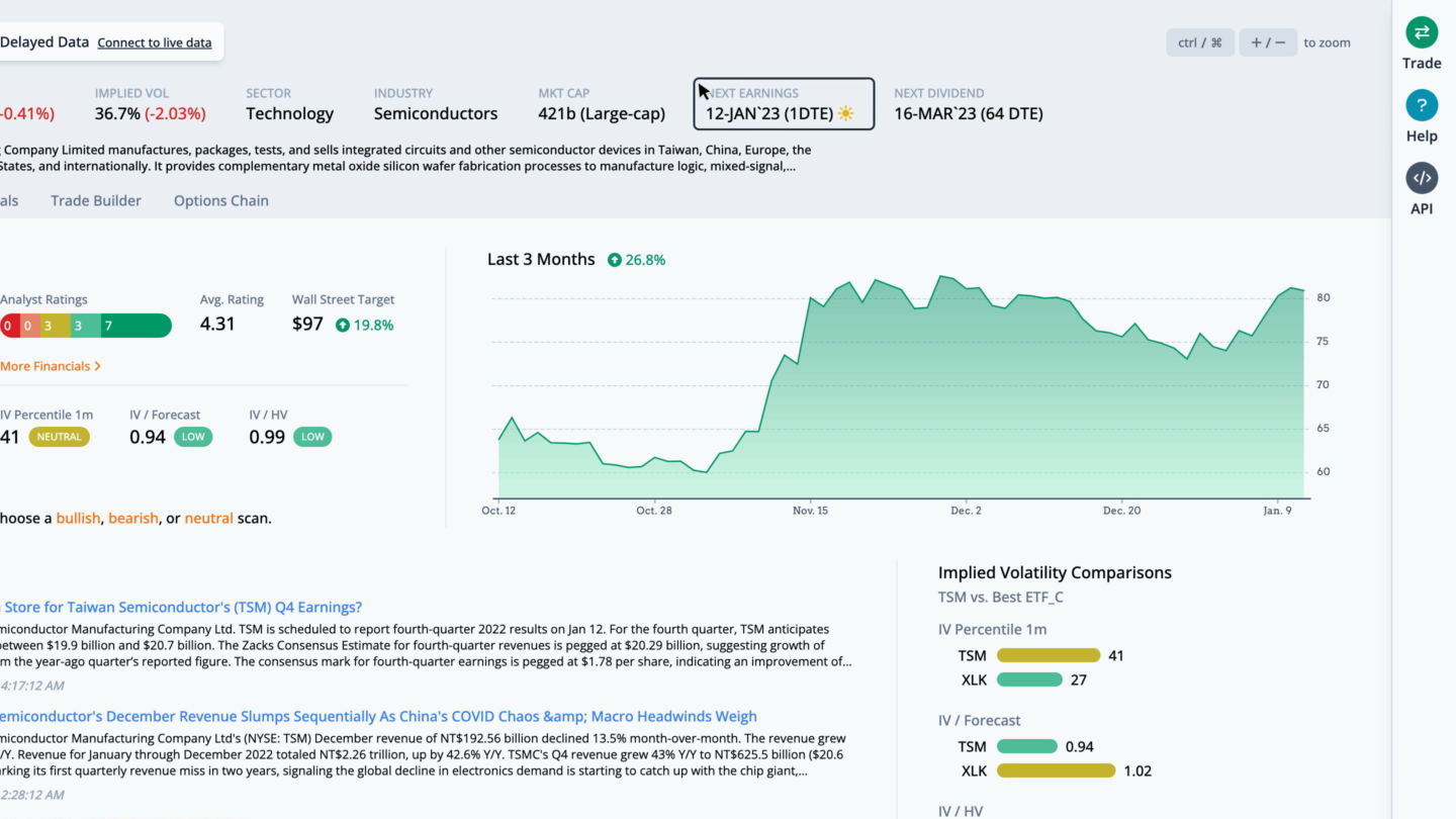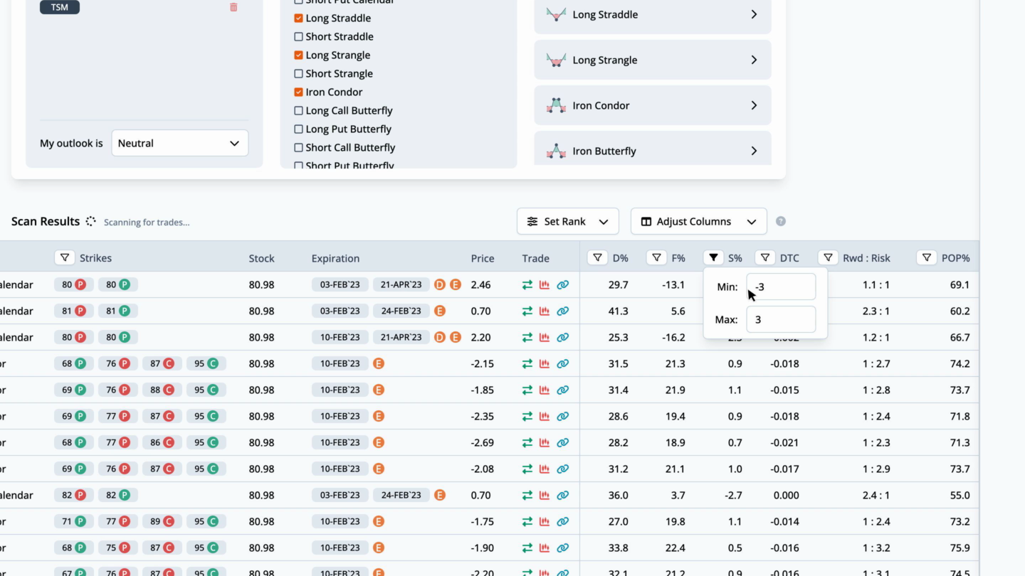 For TSM, the current PE ratio is 13.8, which is 38.9% under the average for the last twelve earnings observations. Returning to the overview tab, we can quickly run a scan to find the best option trades. Since earnings are right around the corner, we scan for neutral strategies, then filter the scan results by S%, or smoothed edge, by setting it between negative and positive 3%.