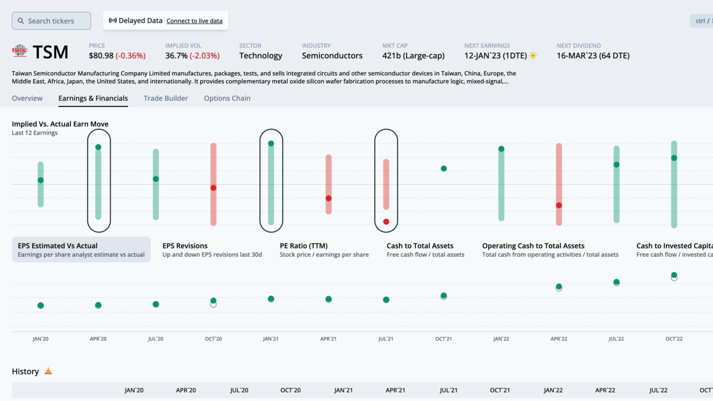 The earnings and financials tab takes us to more detail showing the options market expecting a move of 4.8% in either direction. This move was breached in 4 out of the last 12 earnings.