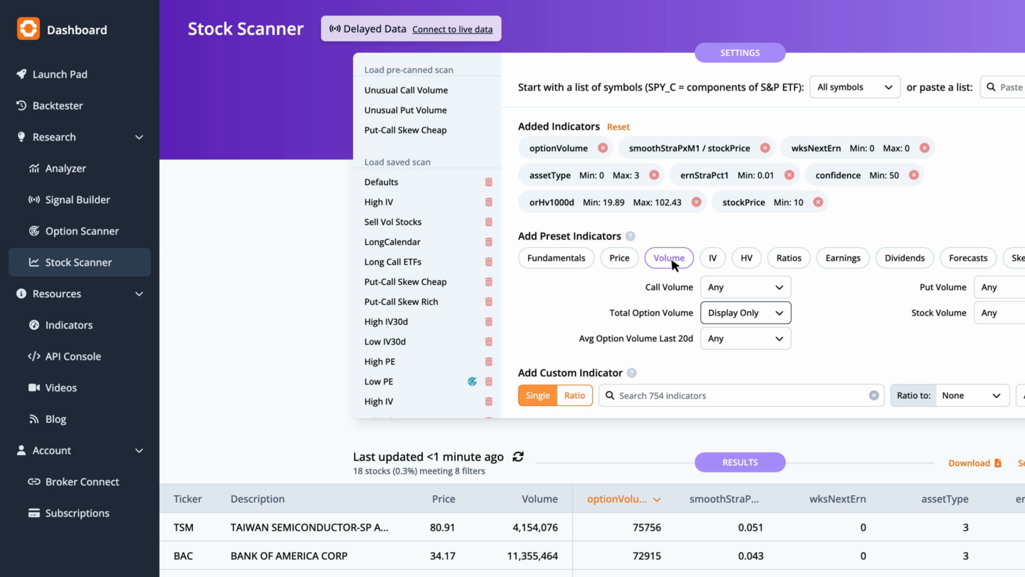 Let’s start by running a scan on stocks reporting earnings this week, which includes the total option volume indicator, sorted from greatest to least.