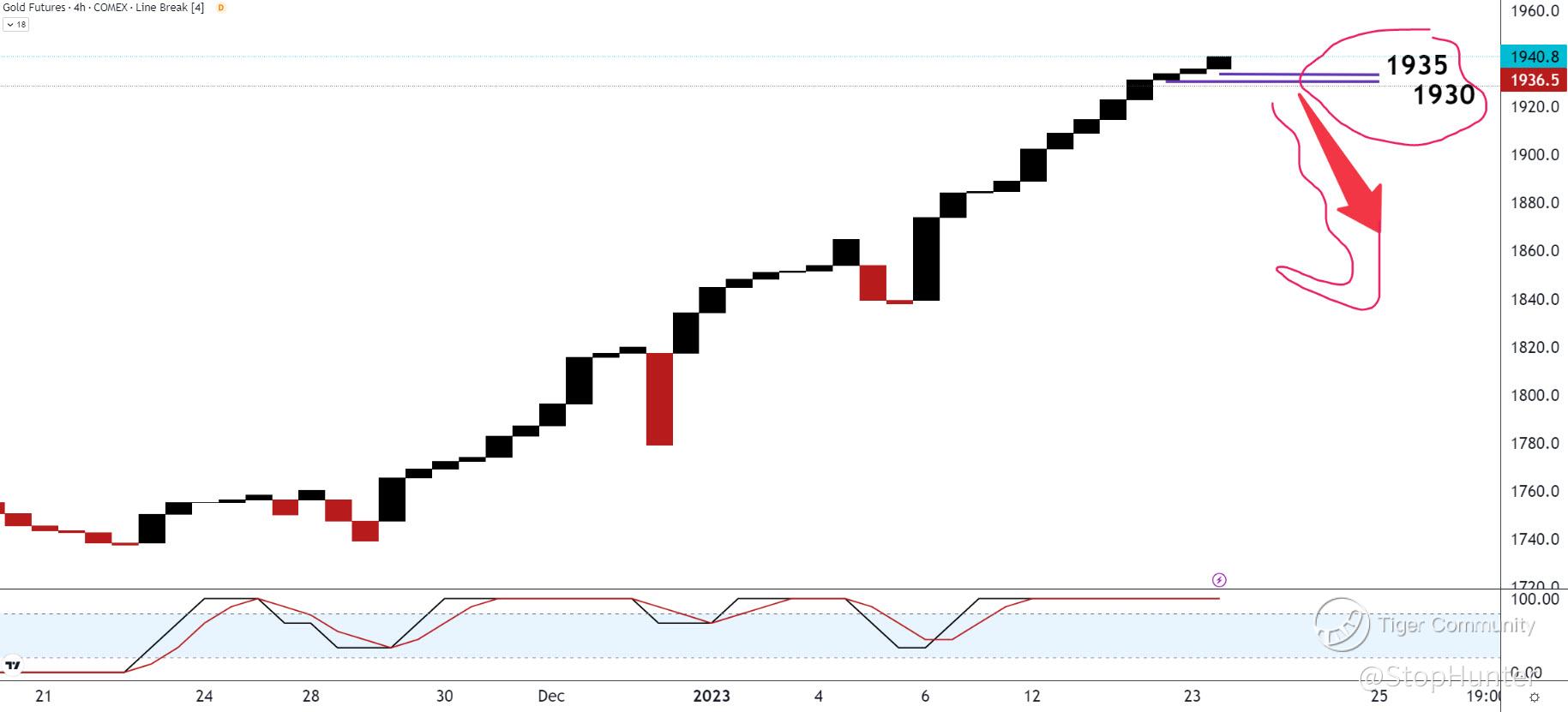 If you are bearish GOLD, take a look at the attached Line Break chart signalling a bearish reversal - you could be more aggressive and get in at 1935 or be more patient and wait for 1930 levels.