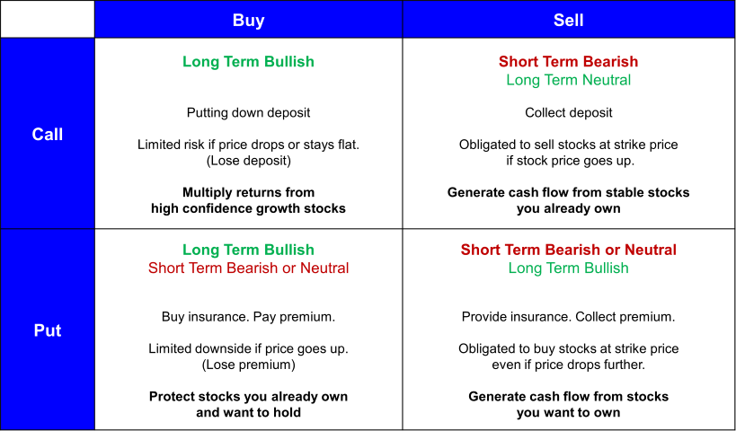 There are 2 main types of options – a call option and a put option. A call option is an agreement to buy or sell a stock at a certain price at some future date, no matter what the market price is at the time. A put option is an agreement to sell a stock at a certain price at some future date, no matter what the market price is at the time. One analogy that I learned which I thought makes a lot of sense is that buying a call option is like putting down a deposit and locking in the price – say putting down a deposit for a wedding venue. In exchange the venue operator will not be able to increase the price on me nor will he be able to rent out the venue to anyone else, even if the other client is willing to pay more. Similarly, buying a put option is like buying insurance. So if something bad happens, like the stock price crashes, the put option allows me to sell the stocks at the agreed price even if the stock has crashed to a much lower value. And just as with any other insurance, I will have to pay a premium for this safety net. These analogies actually really helped me understand the concept of options.