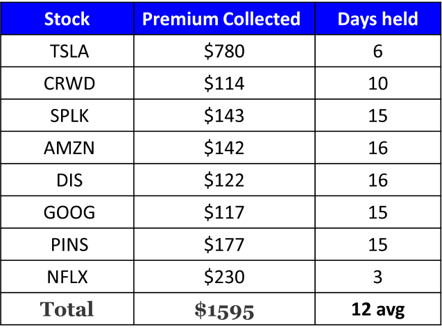 The first group of trades I made was selling puts with the intention of collecting premiums for additional income. I also own most of these stocks and do not mind owning more. All in all, I made over $1600 from these trades, with the bulk coming from Tesla, where I actually sold weekly contracts every week. The other stocks did not give me significant premiums from the weekly contracts, so I looked at 2-3 week contracts to increase the premium while also minimizing the effort to monitor it. I probably could have made more from weekly contracts, but I am happy with the premiums so far. As the market was bullish, the selling of puts proved to be quite profitable.