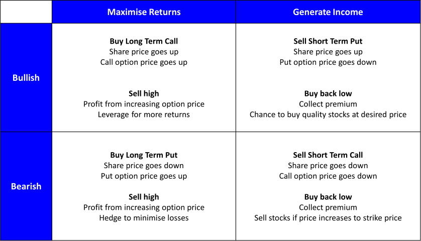 So, if I am bullish about the market, I can buy long term calls to profit from the expected increasing share price, and even more as the options act as leverage to maximize returns with much lower cash outlay compared to buying the stocks. Alternatively, I can sell short term puts and collect premiums for cash flow while being prepared to purchase the underlying stocks should the price go below the strike price. While this will require capital, it need not be a bad outcome if it means we can collect quality stocks at reasonable prices. Similarly, if I am bearish, I can buy long term puts to profit from the increasing option price when stock prices go down, or sell short term covered calls to collect the premium.