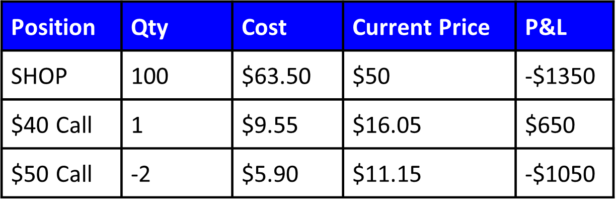 So as a real and specific example, I actually own 100 shares of Shopify (SHOP) which I bought some time ago at a price of $63.50. When I entered into the repair position, the share price of SHOP was around $40, and I was sitting on a significant loss of $23.50.