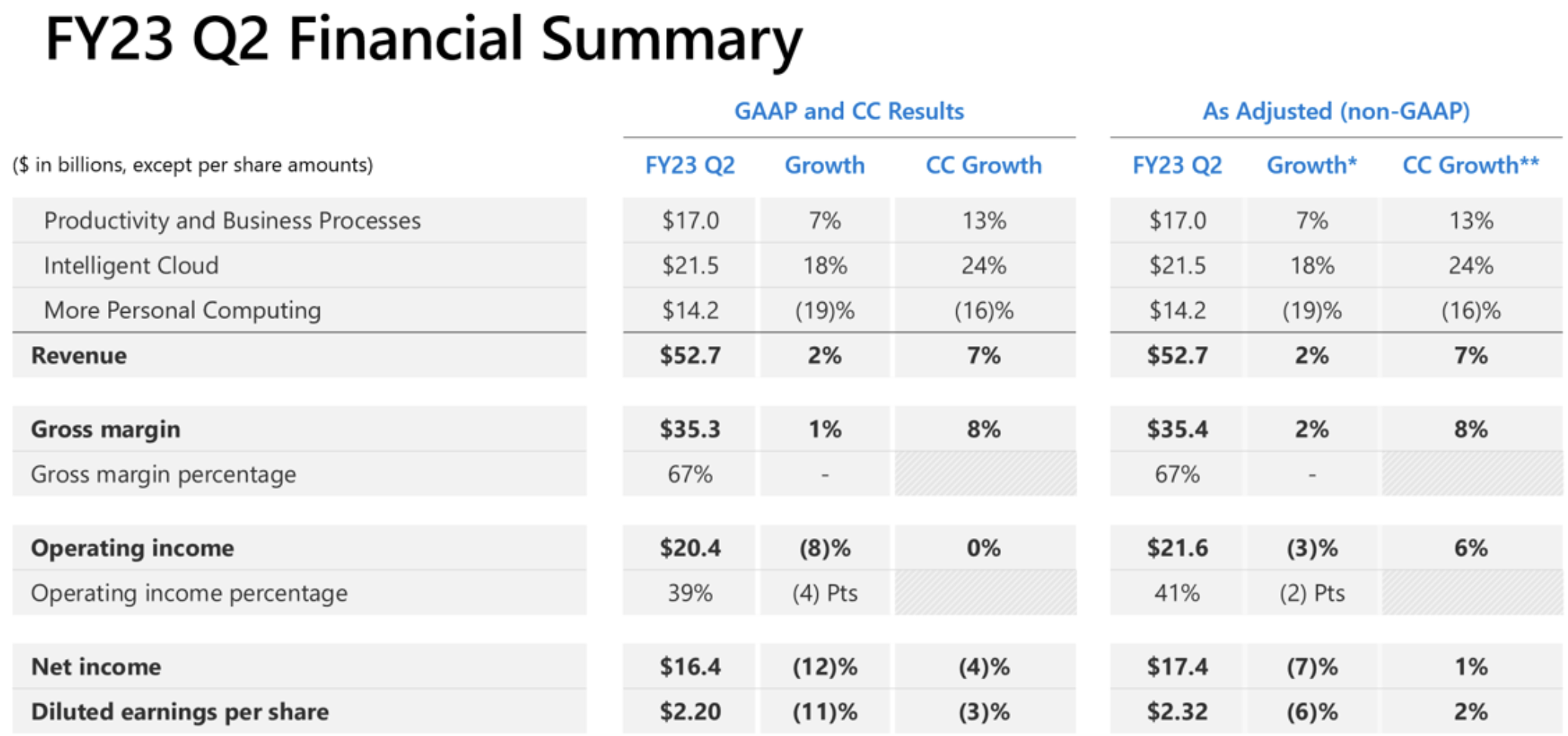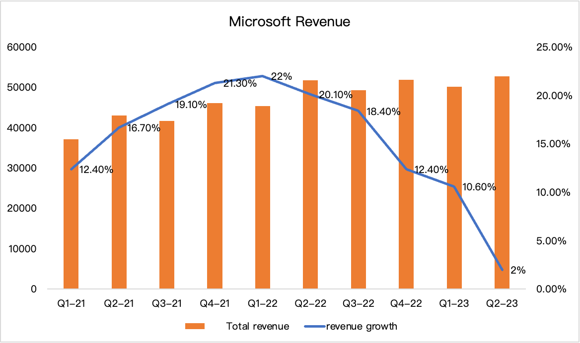 According to key data, Microsoft's revenue in the second quarter of fiscal year 2023 was US $52.75 billion, slightly lower than the market expectation of 52.94 billion,Year-on-year increase of 2% .It is the lowest level since 2016.Operating income was $20.4 billion GAAP and $21.6 billion non-GAAP, and decreased 8% and 3%, respectively. Net income was $16.4 billion GAAP and $17.4 billion non-GAAP, and decreased 12% and 7%, respectively. Diluted earnings per share was $2.20 GAAP and $2.32 non-GAAP, and decreased 11% and 6%, respectively.