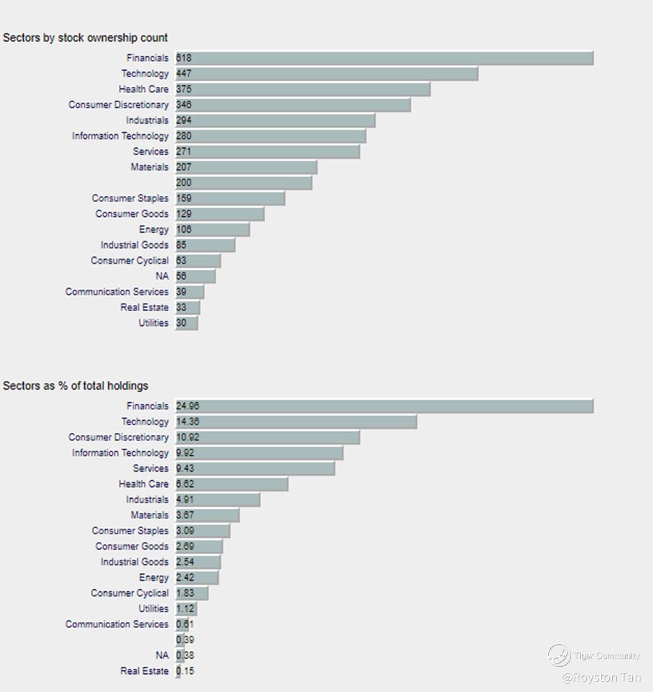 Financials remain the sector which superinvestors are most positive on as of end-2022, with the greatest number of stock holdings and the largest sector % vs. total holdings.