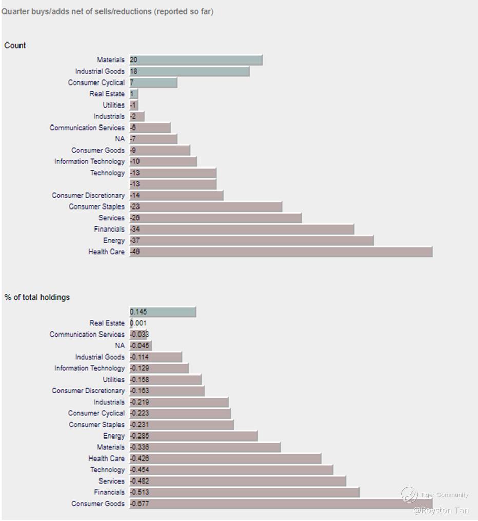 Materials, Industrial Goods and Consumer Cyclicals are the 3 sectors that see positive share adds by superinvestors in 4Q22.